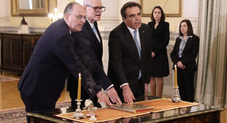 Στο Προεδρικό Μέγαρο ορκίστηκαν τα νέα μέλη της κυβέρνησης, Μαργαρίτης Σχοινάς στο υπουργείο Αγροτικής Ανάπτυξης και Τροφίμων, ο υφυπουργός Αγροτικής Ανάπτυξης και Τροφίμων Μακάριος Λαζαρίδης και ο Ευάγγελος Τουρνάς στο υπουργείο Κλιματικής Κρίσης και Πολιτικής Προστασίας.