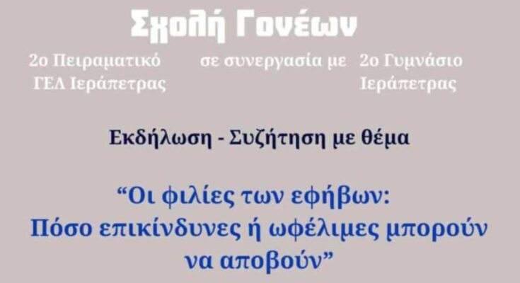 Το 2ο Πειραματικό Γενικό Λύκειο Ιεράπετρας, σε συνεργασία με το 2ο Γυμνάσιο Ιεράπετρας, διοργανώνει εκδήλωση – συζήτηση με θέμα: «Οι φιλίες των εφήβων: Πόσο επικίνδυνες ή ωφέλιμες μπορούν να αποβούν».